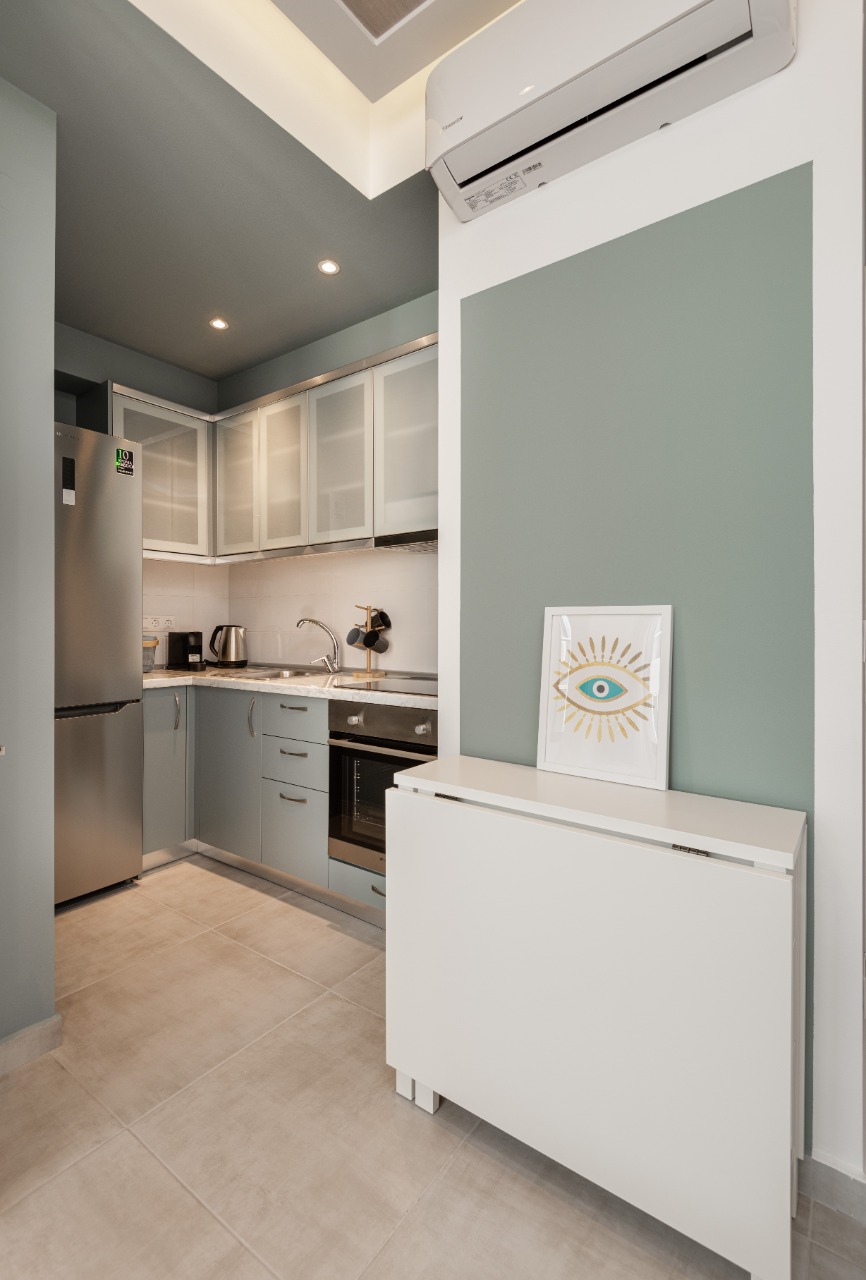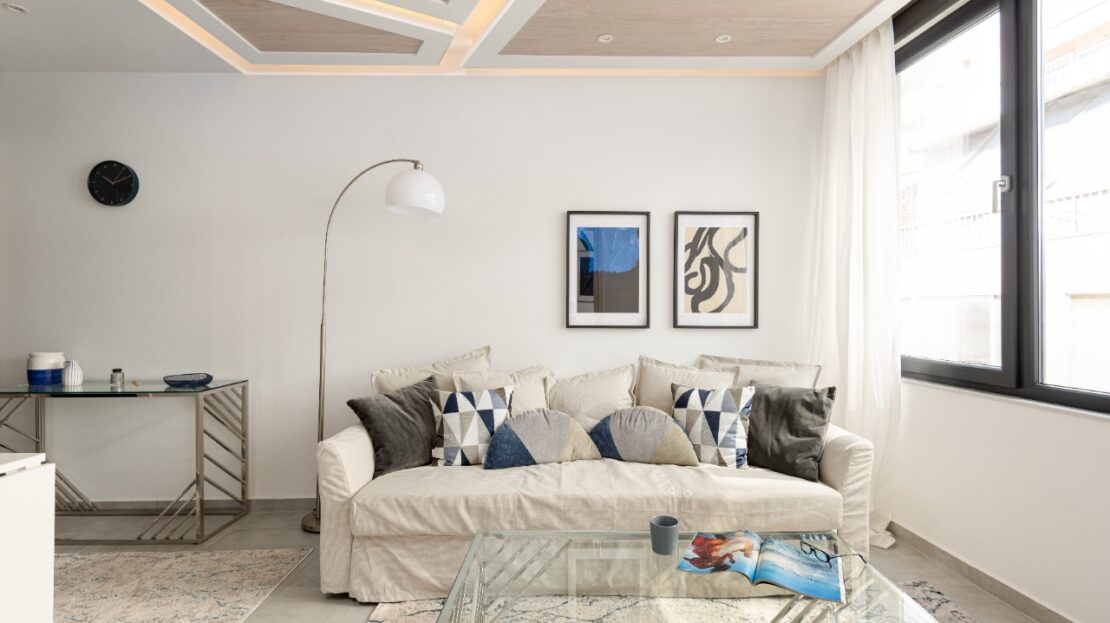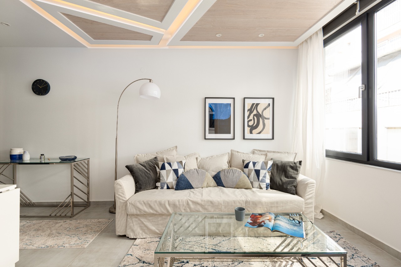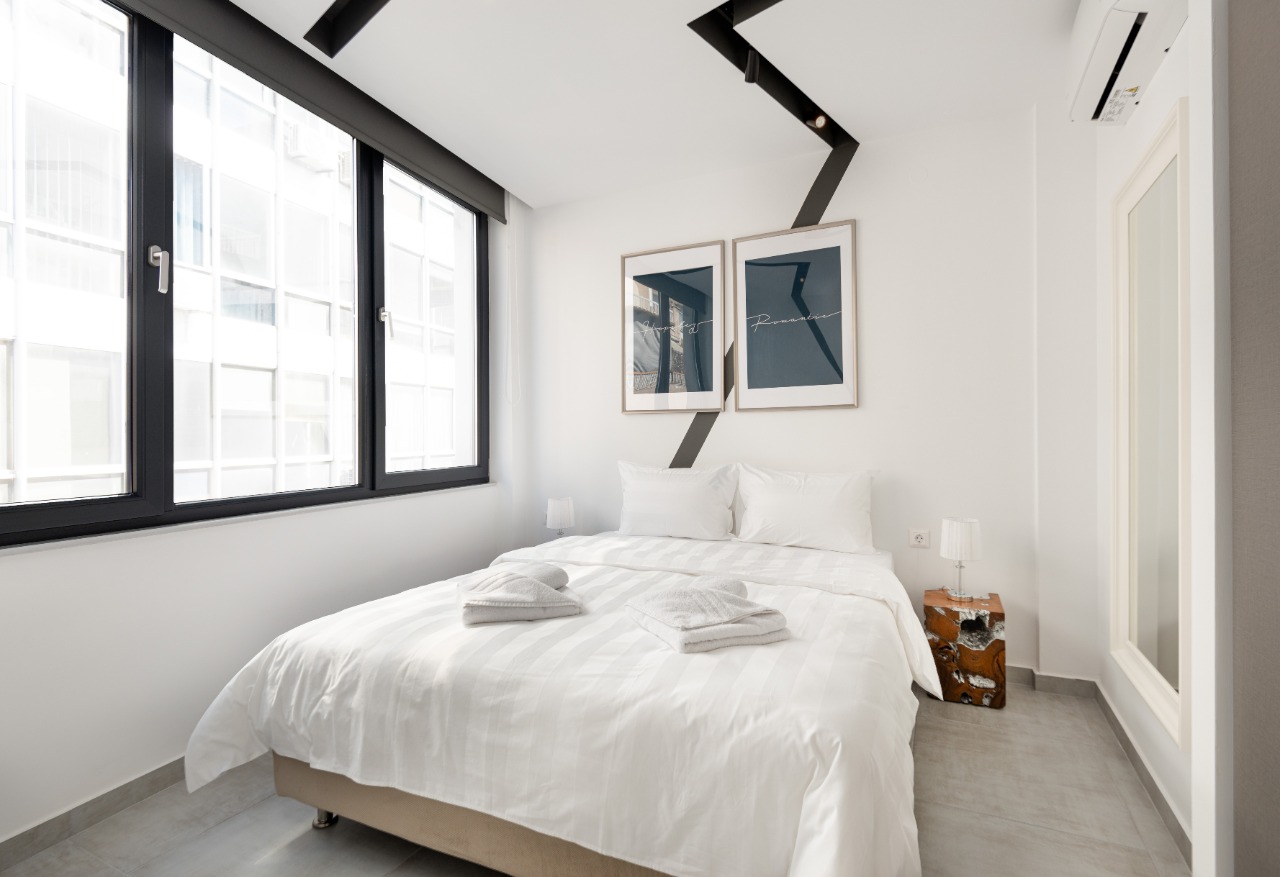The 45 sq.m. renovated luxury apartment, 3rd floor, located in the center of Thessaloniki in an excellent and central location. It consists of a living room, kitchen, bedroom, bathroom. It is fully furnished and equipped and has air conditioners in every area. The windows have energy efficient double glazing.